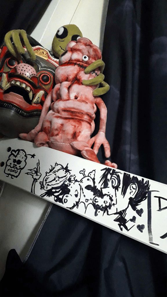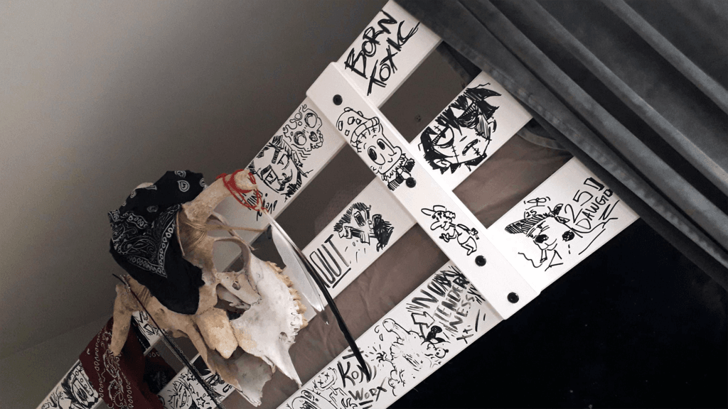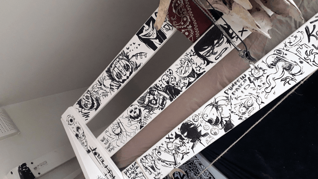 When I lived in a small studio apartment in 2021-2022 I didn’t have much space so I bought this loft bed thing. It looked pretty bland so I had my friends and I draw on it. Here’s some of my stuff.